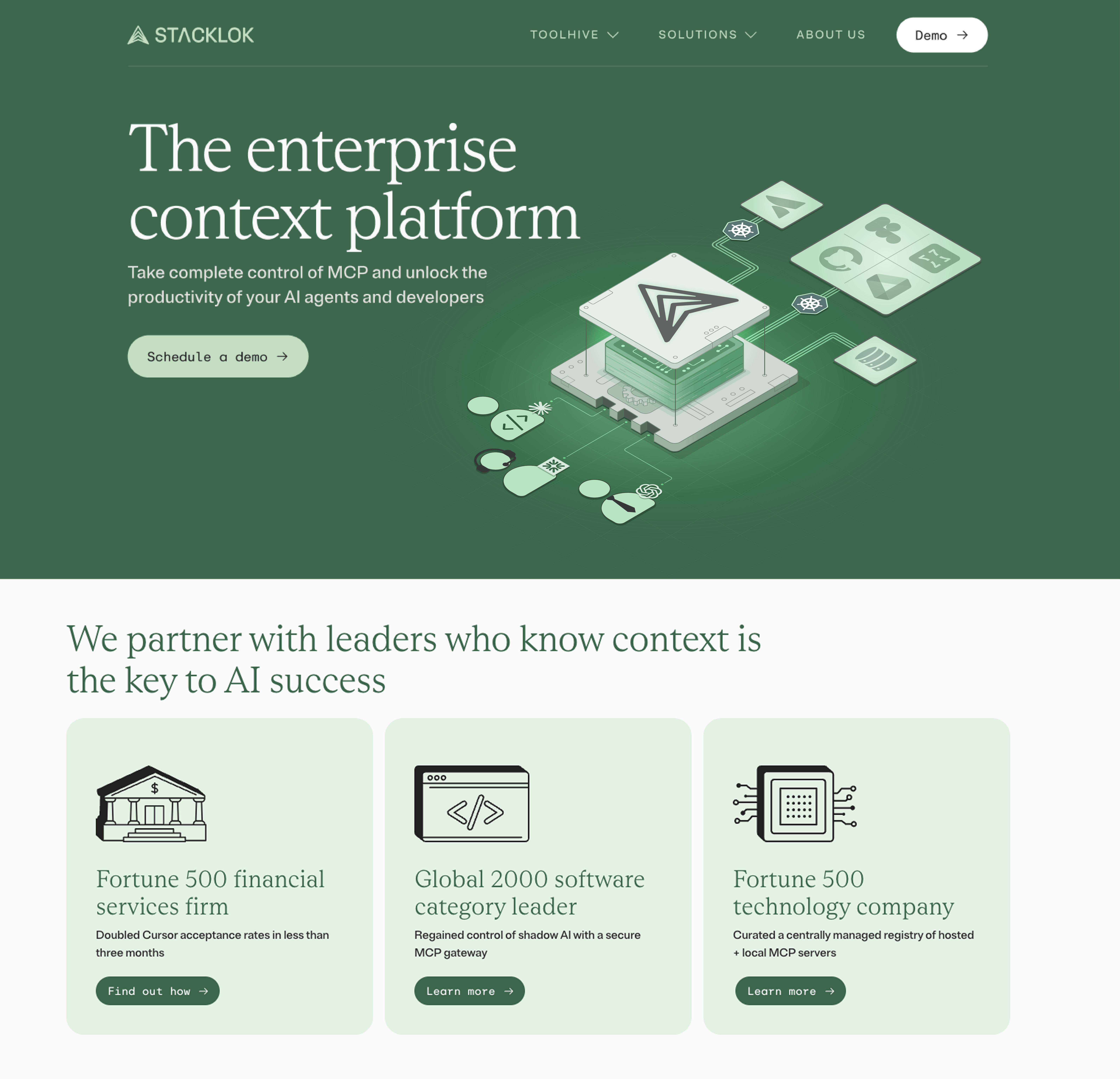 I created the homepage hero and a modular icon system for the Stacklok.com redesign. The hero illustrates Stacklok’s MCP platform as a structured, interconnected system, adding visual interest without distracting from the core messaging. The accompanying icon set was built as a cohesive system with consistent geometry and styling, designed to scale across customer stories, feature sections, and product pages.