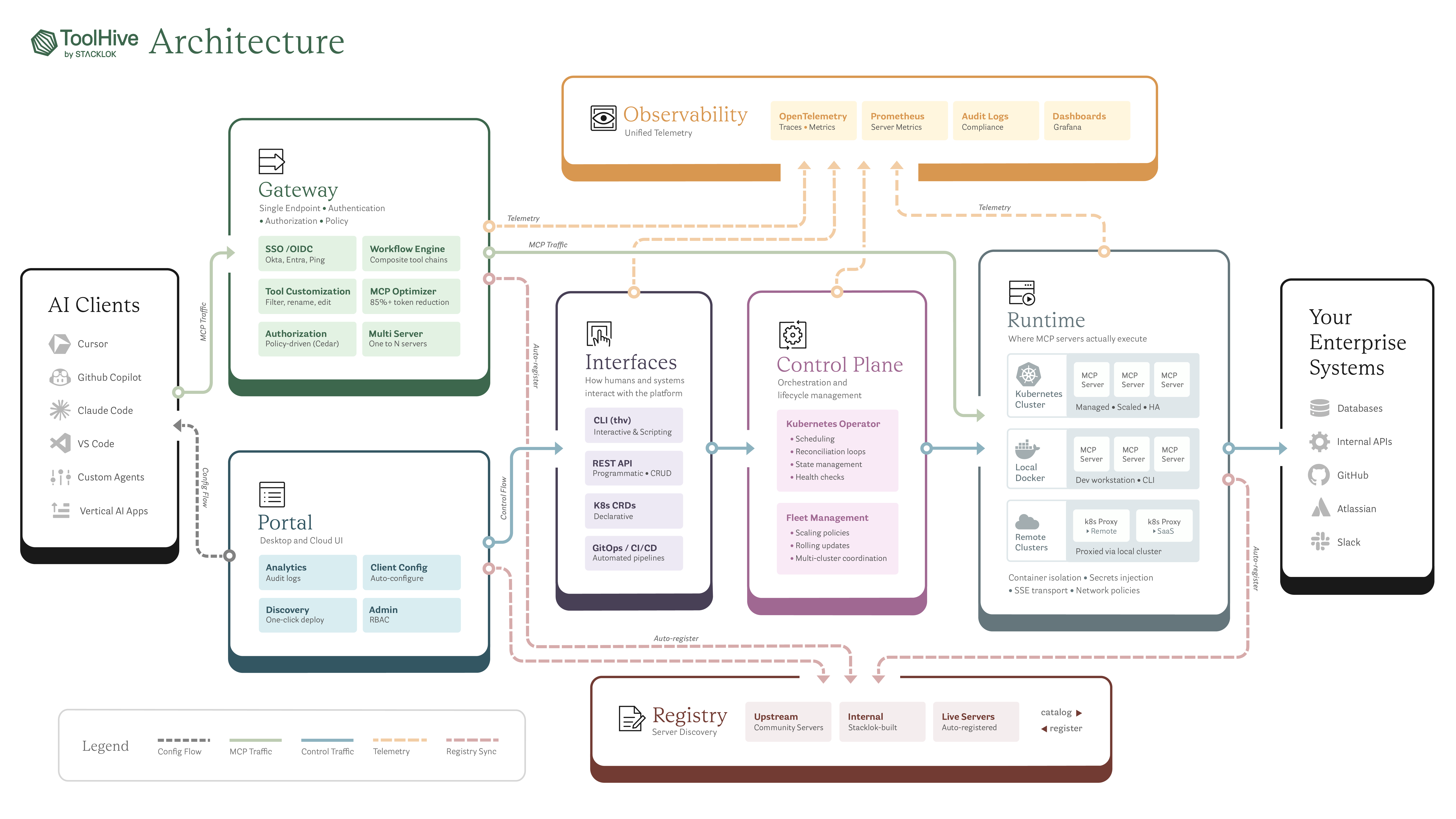 This diagram visualizes the full ToolHive platform, from AI clients and gateways through orchestration, runtime, and enterprise systems. The primary challenge was making a highly complex system readable at a glance without flattening the technical nuance.